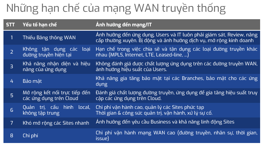 Đối với mạng WAN truyền thống, các kênh truyền dẫn chi phí cao DSL, MPLS, Fiber, LTE tách biệt với nhau và kết nối bằng các cụm Router Edge tại chi nhánh. Do đó chi phí triển khai rất tốn kém nhưng hiệu năng mạng thì không hiệu quả.