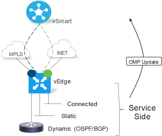 OMP Route Redistribution: OMP tự động thực hiện Redistribute một số loại Route mà nó học được từ bên trong Site nội bộ hoặc từ các Routing Peering.